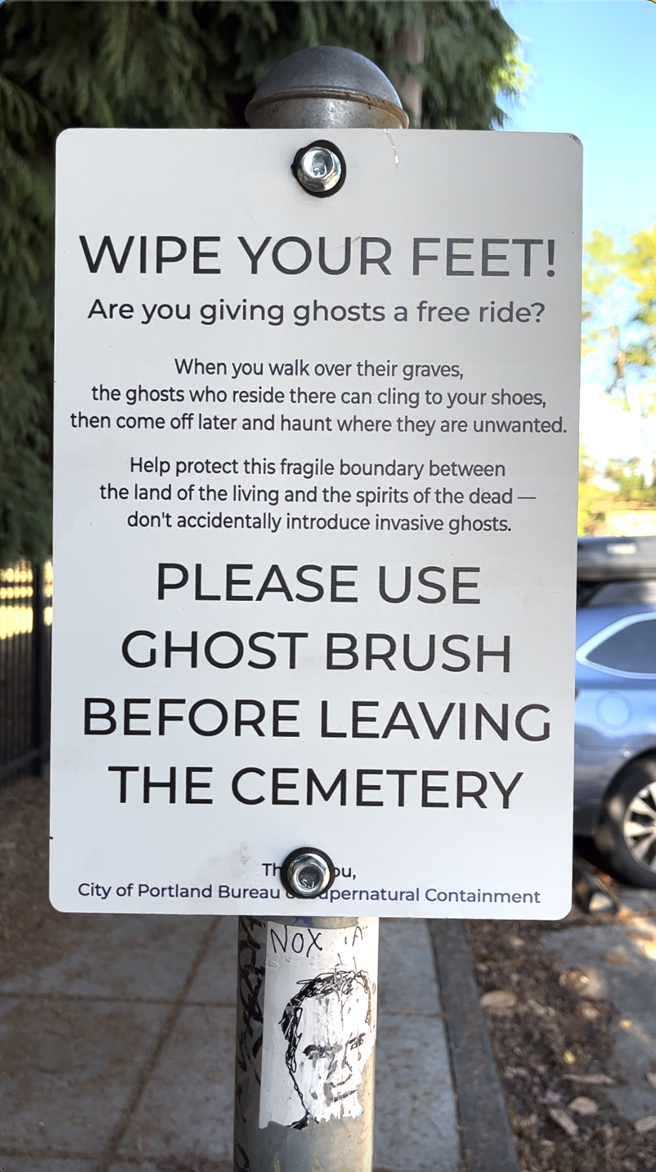 Inspired by the foot brushes at trailheads that discourage the spread of invasive plants, this functioning shoe brush and signage are provided to keep ghosts where they belong.